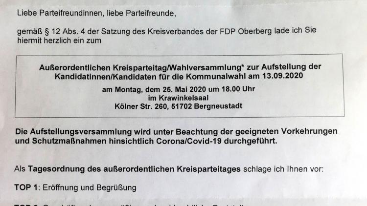 Die wegen der Corona-Krise verschobene Kreiswahlversammlung findet nun als ausserordentlicher Kreisparteitag/Wahlversammlung am 25.Mai 2020 in Bergneustadt statt.Gewählt werden die Bewerber für die 27 Wahlkreise und die Reserveliste. Außerdem stellt sich Jochen Hagt, Kandidat der CDU Oberberg zur Landratswahl, vor